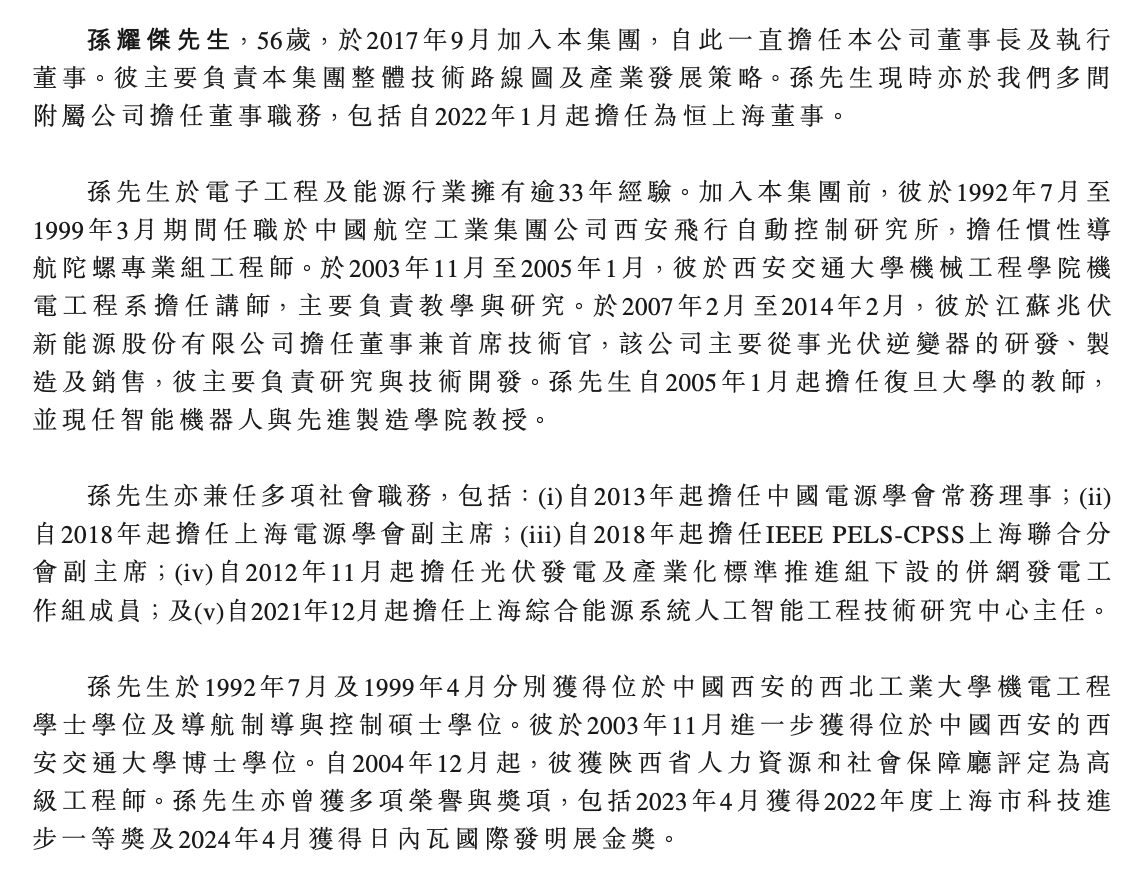 资料显示,孙耀杰,56岁,于2017年9月加入集团,自此一直担任公司董事长及执行董事。其主要负责集团整体技术路线图及产业发展策略。孙耀杰现时亦于公司多间附属公司担任董事职务,包括自2022年1月起担任为恒上海董事。