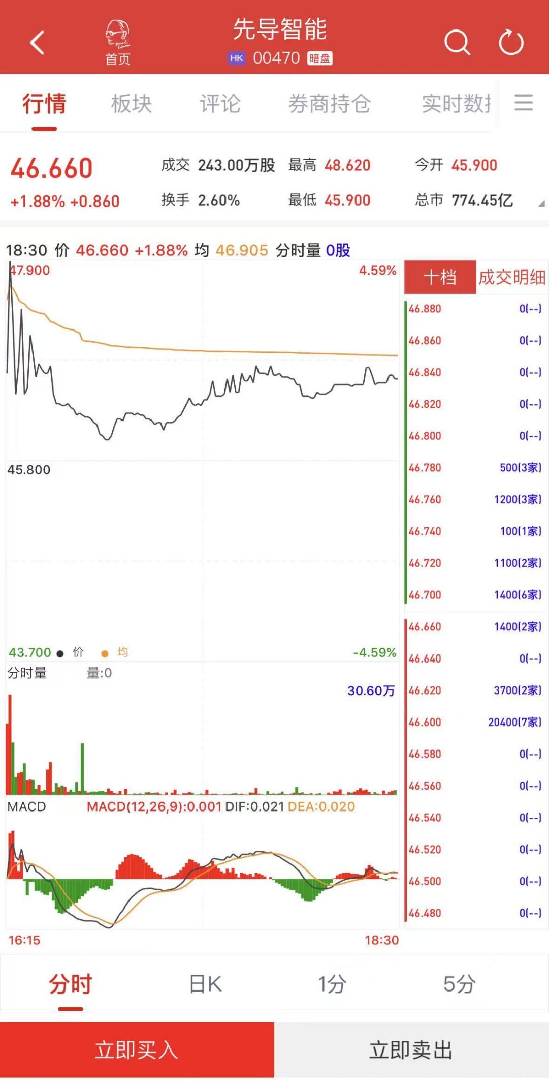 瑞财经 刘治颖 先导智能(00470.HK)将于明日挂牌上市,今日于利弗莫尔证券暗盘交易场中,最高触及48.62港元,较招股价涨6.1%。截至收盘,暗盘交易显示报价46.66港元,较招股价涨1.88%,总市值774.45亿港元。