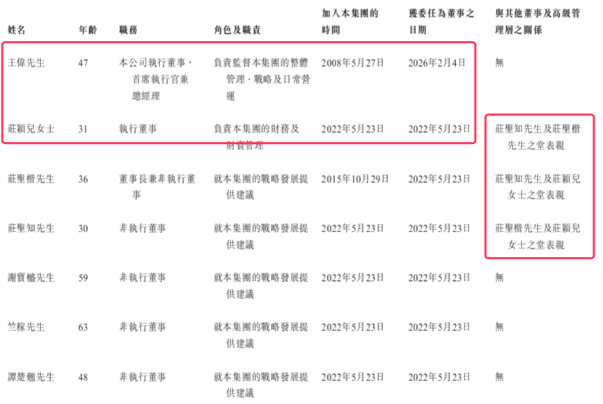瑞财经留意到,公司36岁董事长庄圣楷于IPO递表前调任为非执行董事。庄氏家族一位90后、30岁庄圣知也在同一时间调任为非执行董事。