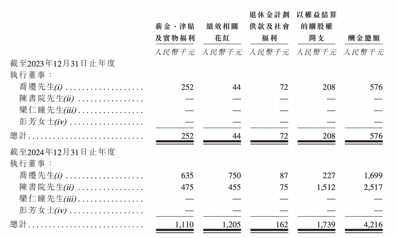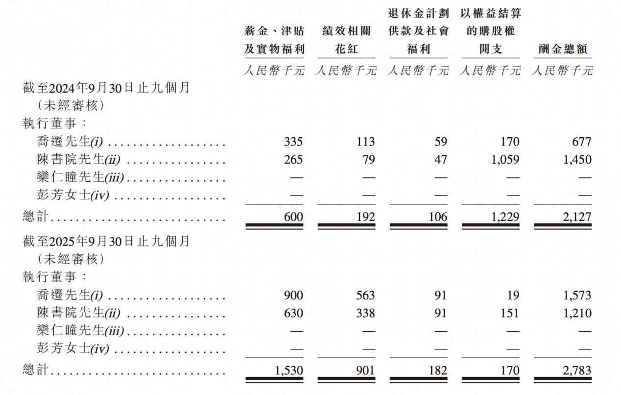 薪酬方面,2023年、2024年及2025年前9月,乔迁薪酬(剔除以权益结算的购股权开支)分别为36.8万元、147.2万元、155.4万元。其中,乔迁2024年、2025年前9月薪酬分别同比增长300%、206.51%。