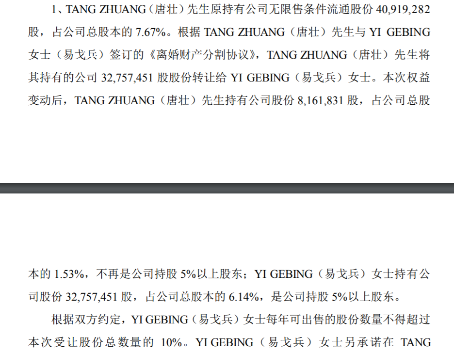 值得注意的是,2023年6月,卓胜微的另一位实控人唐壮在与易戈兵解除婚姻关系后,向后者转让了约3276万股股份。按照公司当日收盘价计算,易戈兵分走约34亿元。