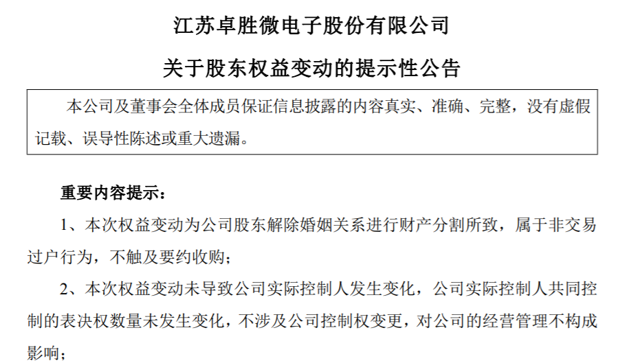 瑞财经 王敏 2月11日,江苏卓胜微电子股份有限公司(以下简称“卓胜微”)发布公告,公司于近日收到实际控制人之一许志翰的通知,其与ZHANG YU(张昱)经友好协商,已解除婚姻关系,并就离婚财产分割事宜做出相关安排。