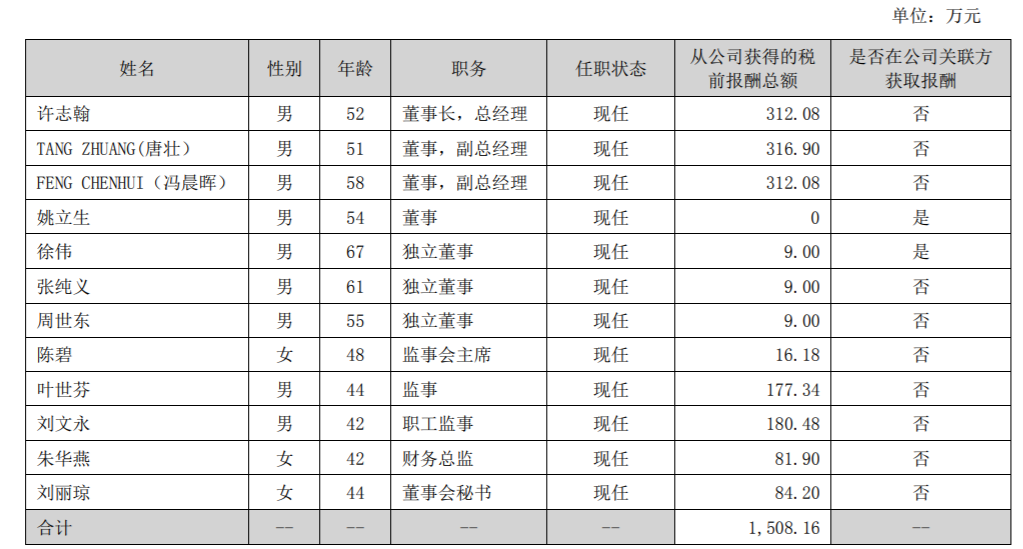 2024年,许志翰薪酬为312.08万元,唐壮薪酬为316.90万元。