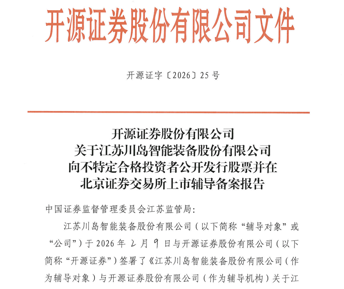 瑞财经 刘治颖 2月13日,江苏川岛智能装备股份有限公司(以下简称:川岛装备)在江苏证监局完成IPO辅导备案,拟北交所上市,辅导机构为开源证券股份有限公司。
