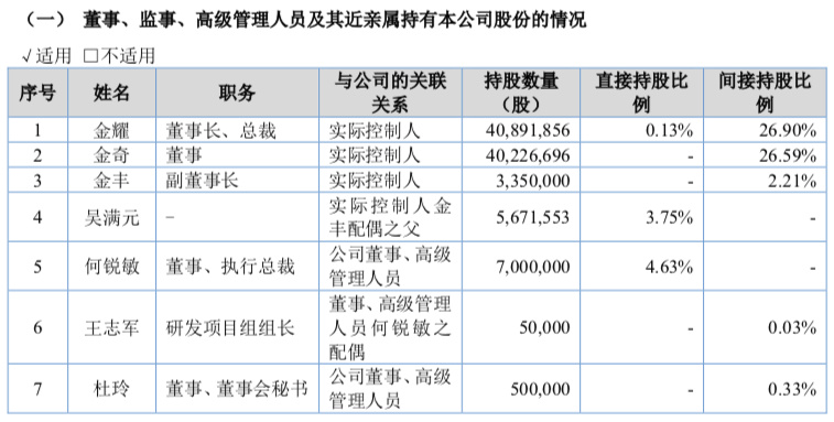 金耀担任公司董事长兼总裁,金丰担任公司副董事长,金奇担任公司董事,三人在公司相关事宜上保持一致行动,为陌桑高科的实际控制人。金丰的岳父吴满元也在公司参股。