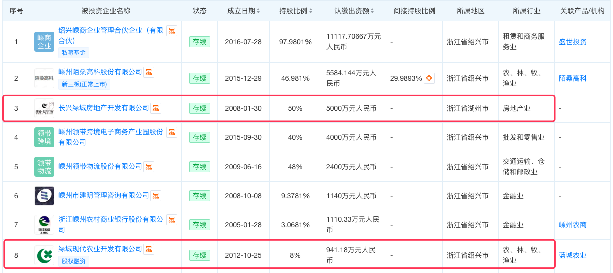 金耀和绿城除了曾在地产有交集,嵊州巴贝领带还参投了绿城现代农业开发有限公司。
