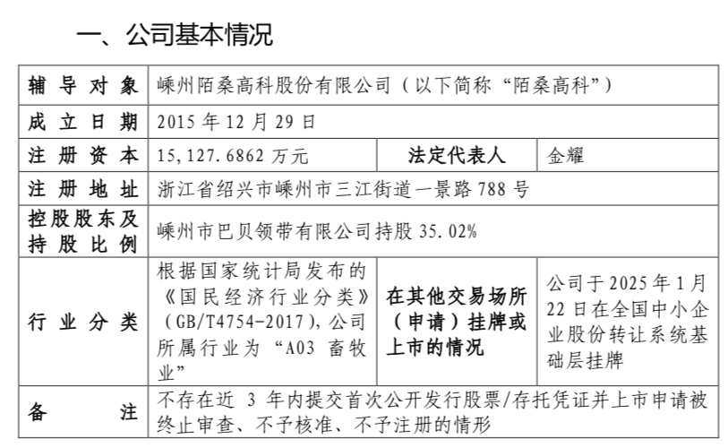 瑞财经 严明会 近日,嵊州陌桑高科股份有限公司(以下简称:陌桑高科)在浙江证监局完成IPO辅导备案,拟北交所IPO,辅导机构中信证券。