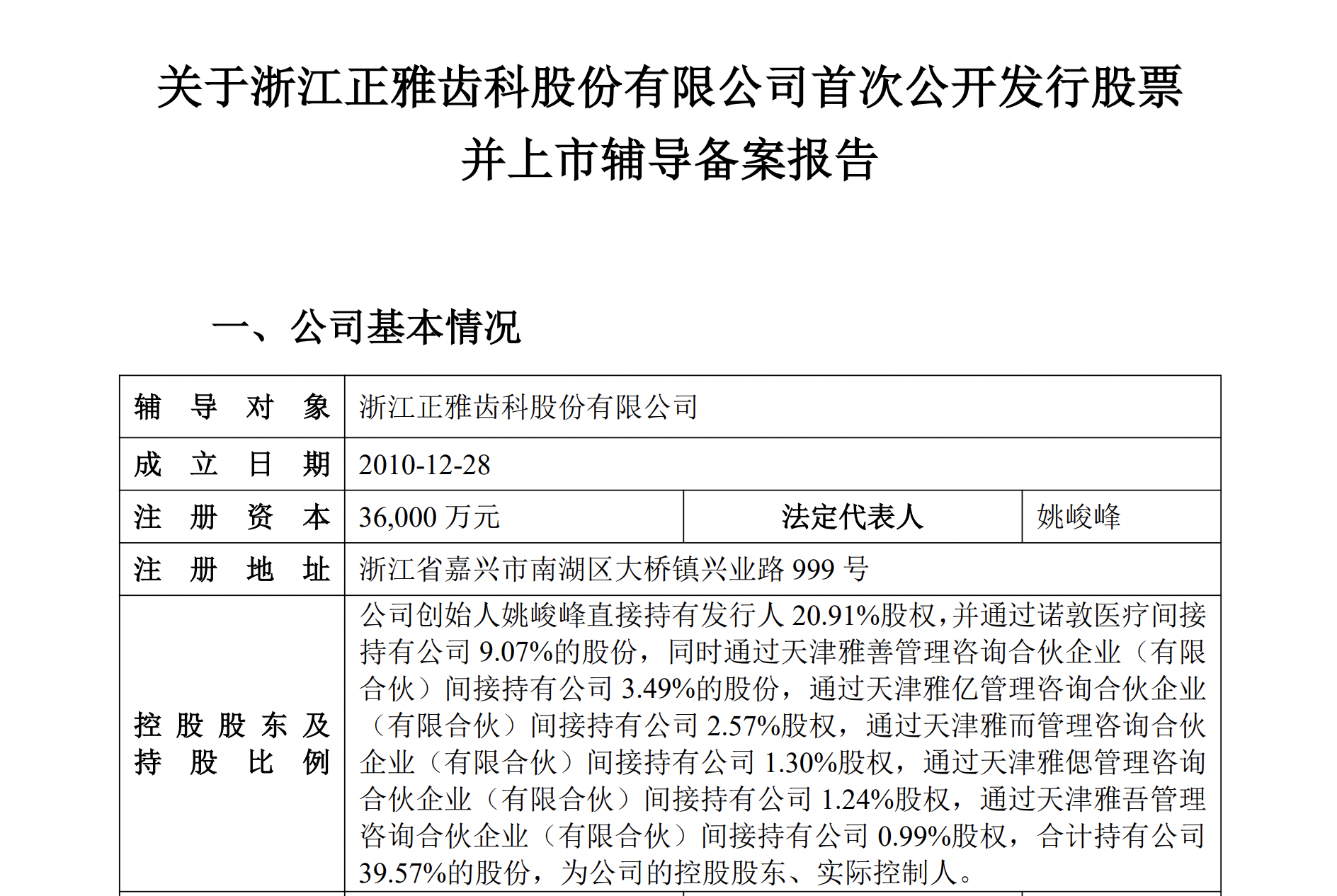 正雅齿科创始人姚峻峰直接持有公司20.91%股权,并通过诺敦医疗间接持有公司9.07%的股份,同时通过天津雅善管理咨询合伙企业(有限合伙)间接持有公司3.49%的股份,通过天津雅亿管理咨询合伙企业(有限合伙)间接持有公司2.57%股权,通过天津雅而管理咨询合伙企业(有限合伙)间接持有公司1.30%股权,通过天津雅偲管理咨询合伙企业(有限合伙)间接持有公司1.24%股权,通过天津雅吾管理咨询合伙企业(有限合伙)间接持有公司0.99%股权,合计持有公司39.57%的股份,为公司的控股股东、实际控制人。