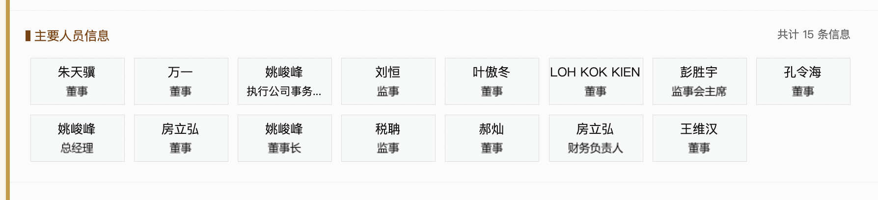 国家企业信用信息公示系统显示,目前,姚峻峰担任公司董事长、总经理、执行公司事务的董事。