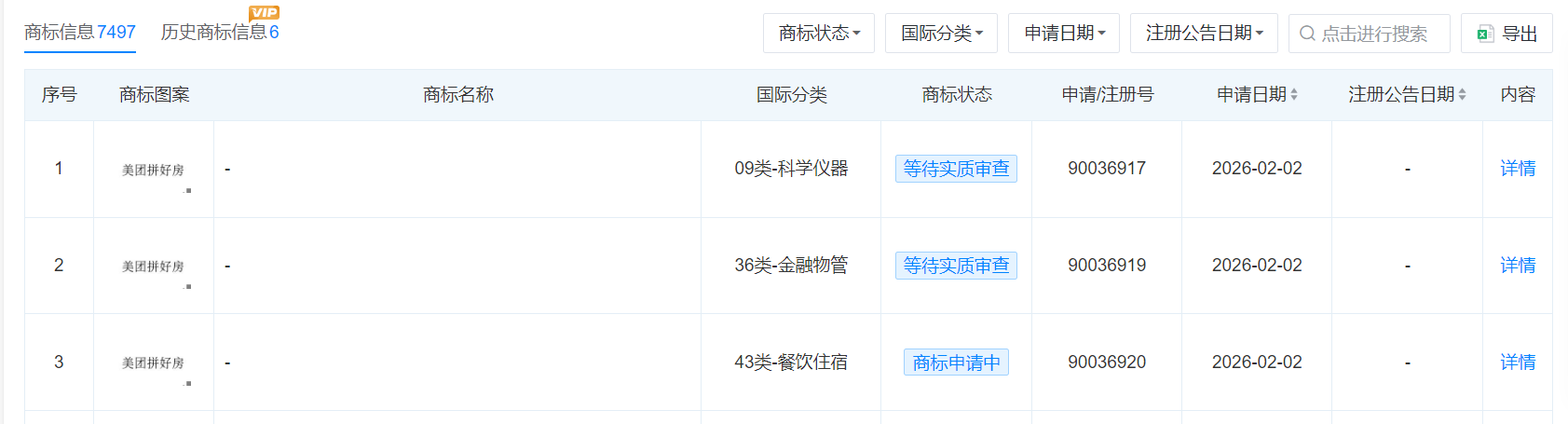 3枚商标国际分类分别为科学仪器、金融物管和餐饮住宿。截至目前,3枚商标中有1枚显示申请中,其余2枚均处于等待实质审查的状态。