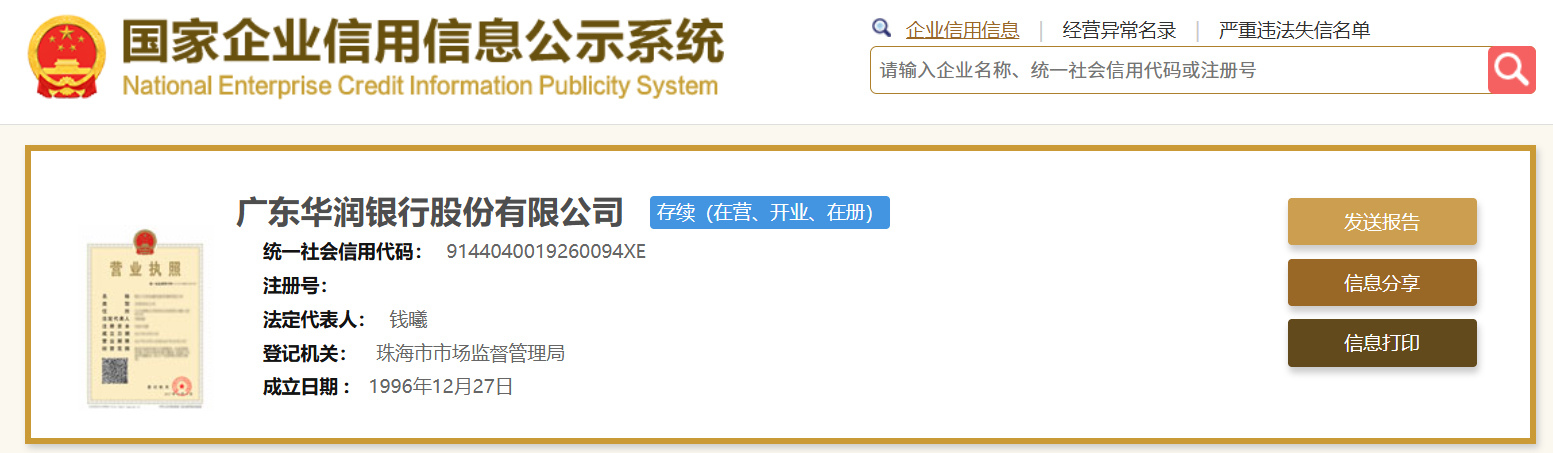瑞财经 王敏 2月28日,国家企业信用信息公示系统显示,此前华润银行的全名“珠海华润银行股份有限公司”目前已变更为“广东华润银行股份有限公司”。
