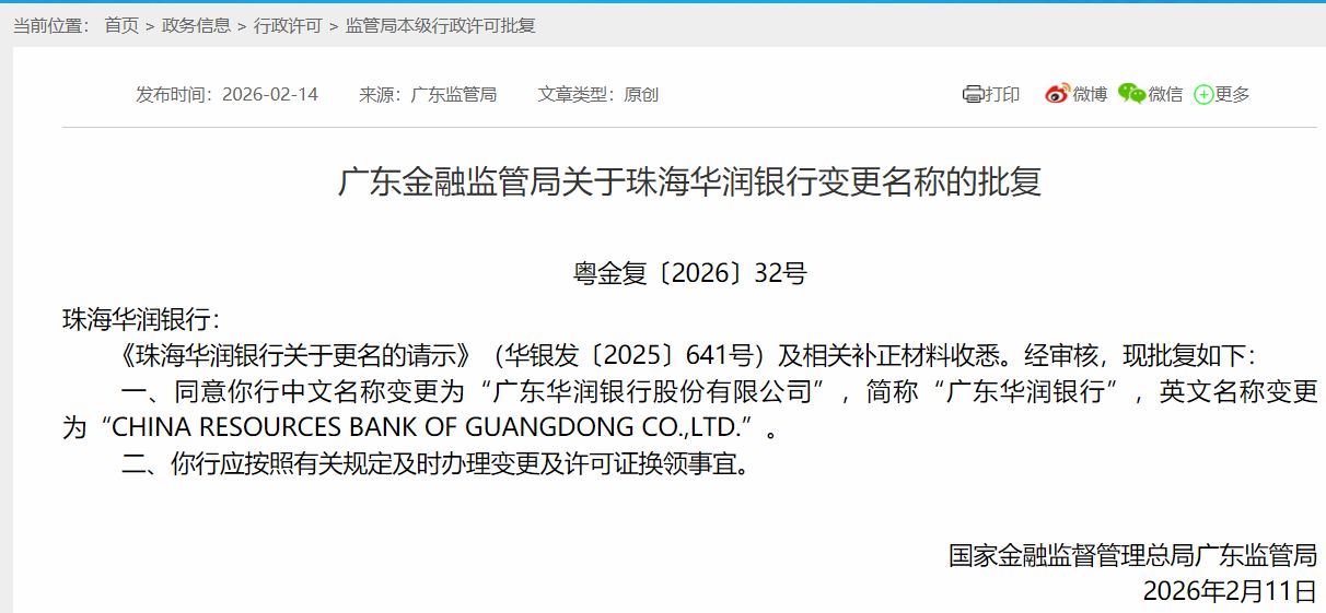 此前,广东金融监管局发布批复称,同意该行中文名称变更为“广东华润银行股份有限公司”,简称“广东华润银行”,英文名称变更为“CHINA RESOURCES BANK OF GUANGDONG CO.,LTD.”,并要求该行按照有关规定及时办理变更及许可证换领事宜。