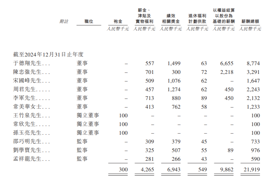2024年,于德翔薪酬为211.9万元(剔除以权益结算以股份为基础的薪酬)。