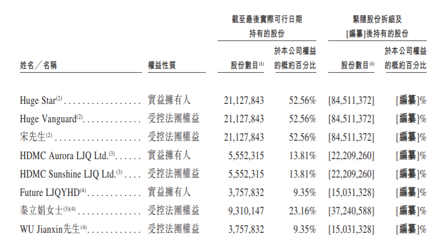 截至最后实际可行日期,沪鸽的董事长、执行董事兼行政总裁宋欣通过Huge Vanguard及Huge Star间接控制公司已发行股份总数52.56%附带的投票权。