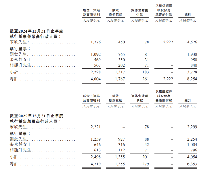 2025年,宋欣薪酬为229.9万元,较2024年的230.4万元(剔除以权益结算以股份为基础的付款)微降;刘钦薪酬为225.4万元,较2024年的193.8万元增长了16.3%。