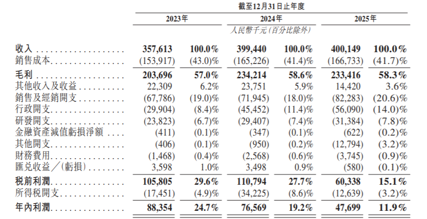业绩方面,2023年度、2024年度及2025年度,沪鸽收入分别约为3.58亿元、3.99亿元及4亿元;同期,年内利润分别为8835.4万元、7656.9万元、4769.9万元。