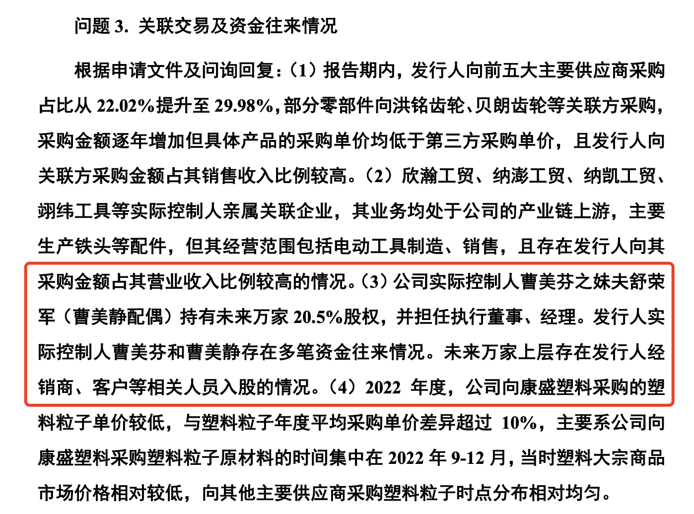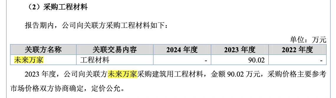 而结合招股书,2023年度,公司向关联方未来万家采购建筑用工程材料,金额90.02万元,采购价格主要参考市场价格双方协商确定,定价公允。