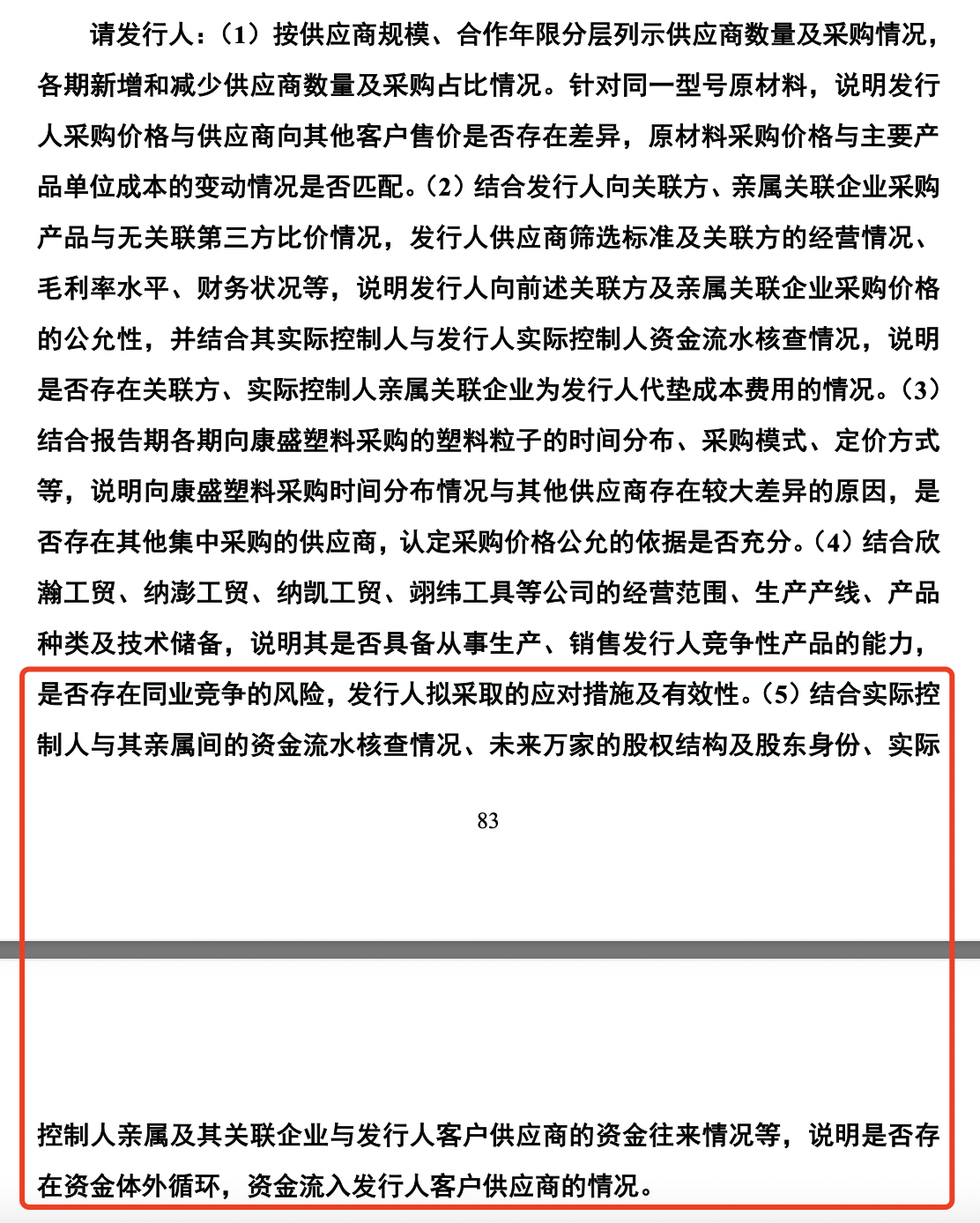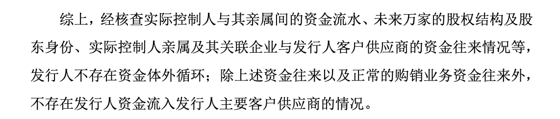 对此,德硕科技表示,经核查实际控制人与其亲属间的资金流水、未来万家的股权结构及股东身份、实际控制人亲属及其关联企业与发行人客户供应商的资金往来情况等,公司不存在资金体外循环;除上述资金往来以及正常的购销业务资金往来外,不存在公司资金流入发行人主要客户供应商的情况。