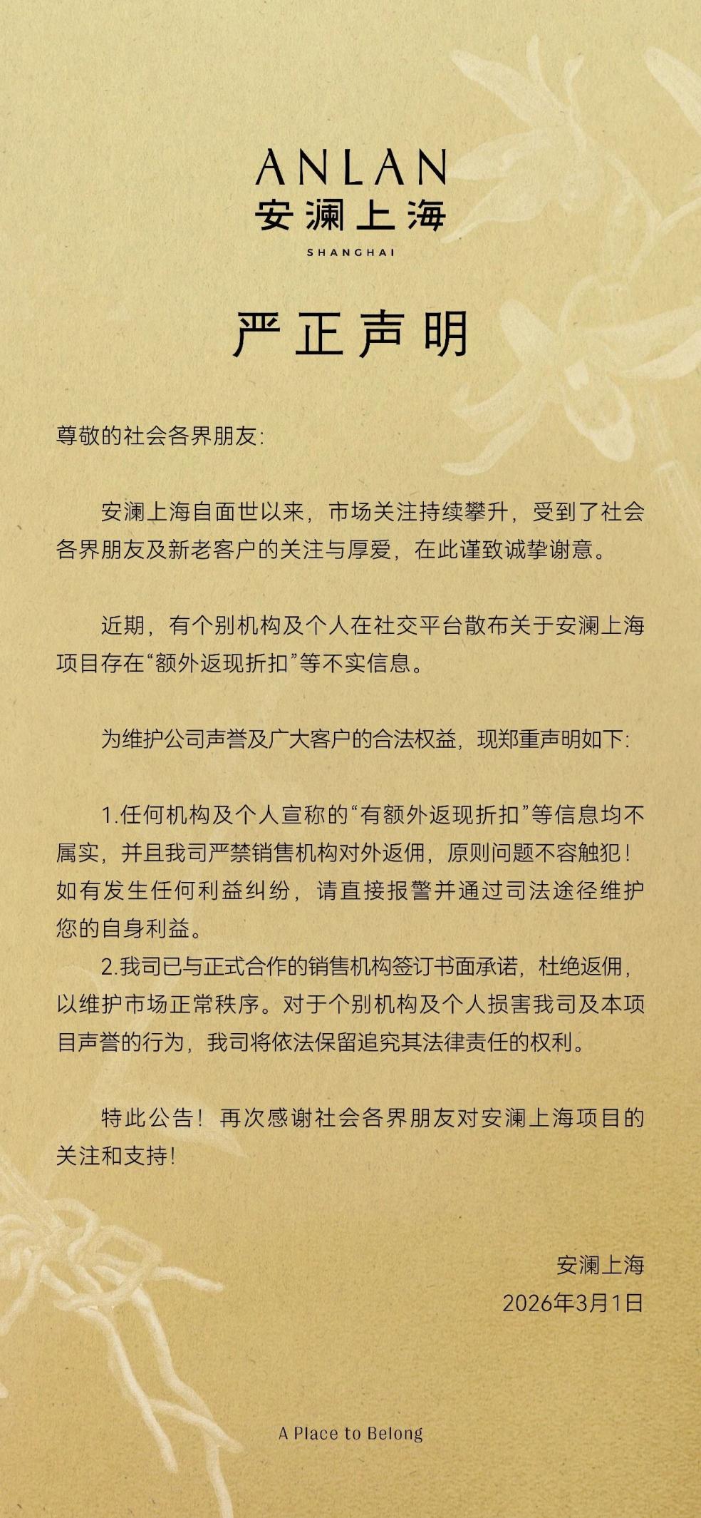 声明称,个别机构及个人在社交平台散布关于安澜上海项目存在“额外返现折扣”等不实信息。对此,安澜上海方面表示,任何机构及个人宣称的“有额外返现折扣”等信息均不属实,且公司严禁销售机构对外返佣。
