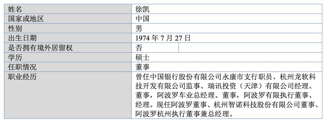 徐凯,男,1974年7月27日出生,硕士学历,曾任中国银行股份有限公司永康市支行职员、杭州龙软科技开发有限公司监事、瑞讯投资(天津)有限公司经理、董事,阿波罗车业总经理、董事,阿波罗有限执行董事、 经理。现任阿波罗董事、杭州智诺科技股份有限公司董事、 阿波罗杭州执行董事兼总经理。