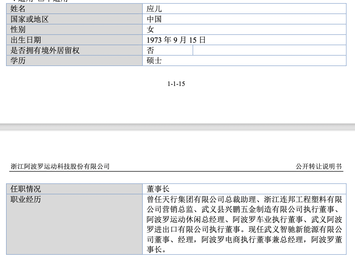 资料显示,应儿,女,1973年9月15日出生,硕士学历,曾任天行集团有限公司总裁助理、浙江连邦工程塑料有限公司营销总监、武义县兴鹏五金制造有限公司执行董事、阿波罗运动休闲总经理、阿波罗车业执行董事、武义阿波罗进出口有限公司执行董事。现任武义智驰新能源有限公司董事、经理,阿波罗电商执行董事兼总经理,阿波罗董事长。