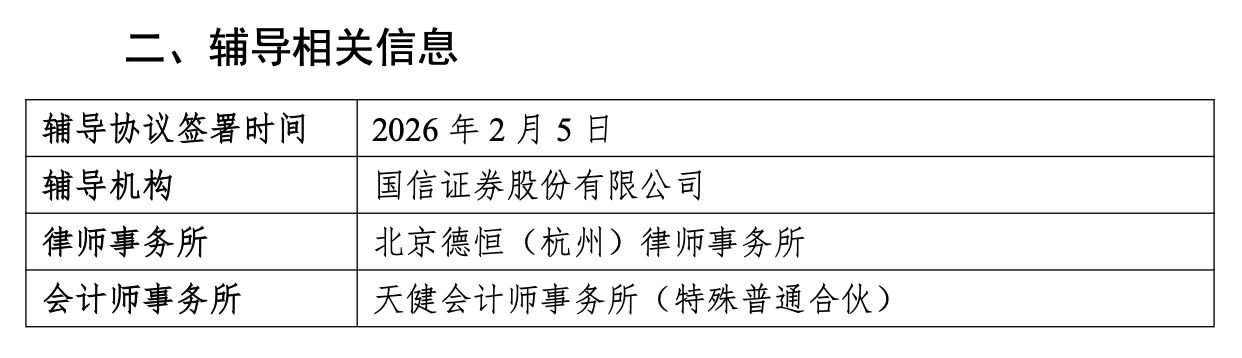 本次IPO的辅导机构为国信证券股份有限公司,律师事务所为北京德恒(杭州)律师事务所,会计师事务所为天健会计师事务所(特殊普通合伙)。