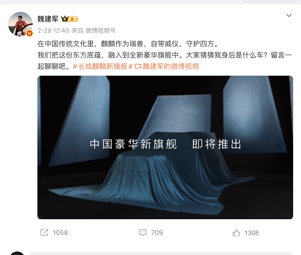 瑞财经 刘治颖 2月28日,长城汽车董事长魏建军在个人微博发布豪华旗舰车型预告视频。