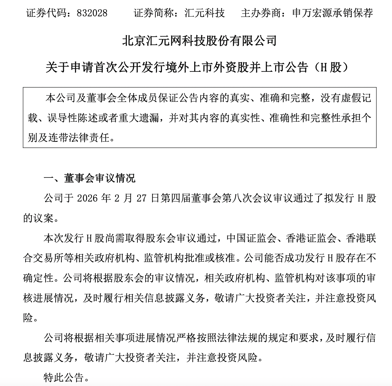 瑞财经 吴文婷 近日,新三板公司汇元科技发布公告称,公司于2026年2月27日第四届董事会第八次会议审议通过了拟发行H股的议案。