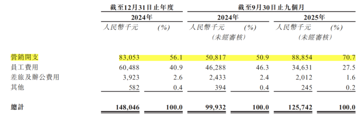另外其销售及分销开支费用占比较高,费用率分别为71.2%、60.6%,维持在高位,一定程度上影响了其整体的盈利空间。2025年1-9月,其销售及分销开支中,营销开支达到8885.4万元,同比增长74.85%,算上2024年,合共砸了1.72亿。反观研发费用率降至20%,销售及分销开支是研发成本的3倍。