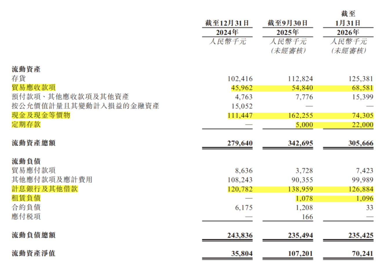 应收账款方面,2025年9月末为5484.0万元,2026年1月31日增至6858.1万元。同期手中现金及现金等价物7430.5万元,较2025年9月30日的1.62亿元,大幅减少,加上2200万元定期存款,不足亿元。同期,其短期债务规模1.28亿元,存在3167.5万元短债缺口。