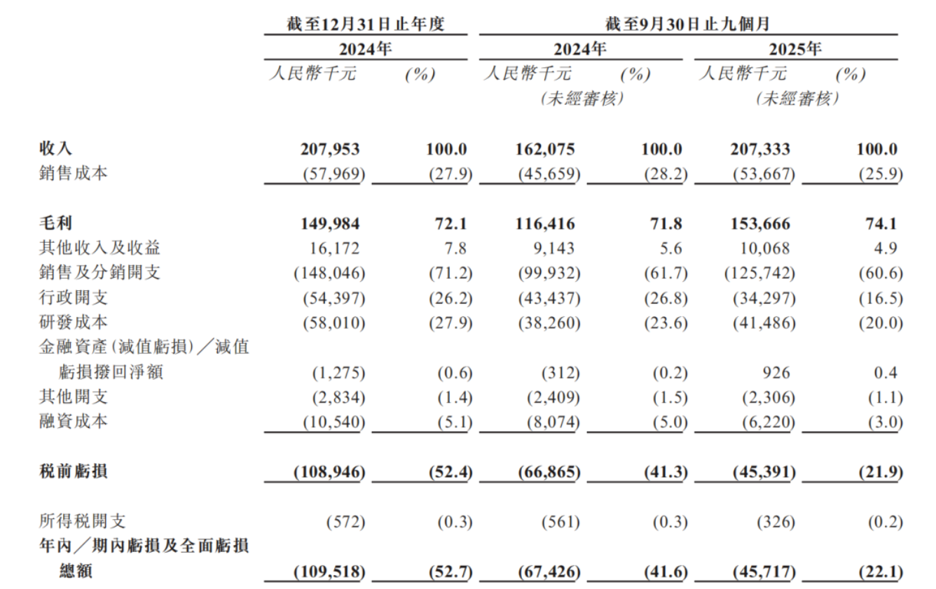 报告期各期,五和博澳净亏损分别为1.10亿元、4571.7万元,2025年1-9月毛利率,同比提升2.3个百分点,亏损幅度同比收窄32.2%;扣除股份支付开支影响后,经调整净亏损分别为8881万元、3685.4万元。