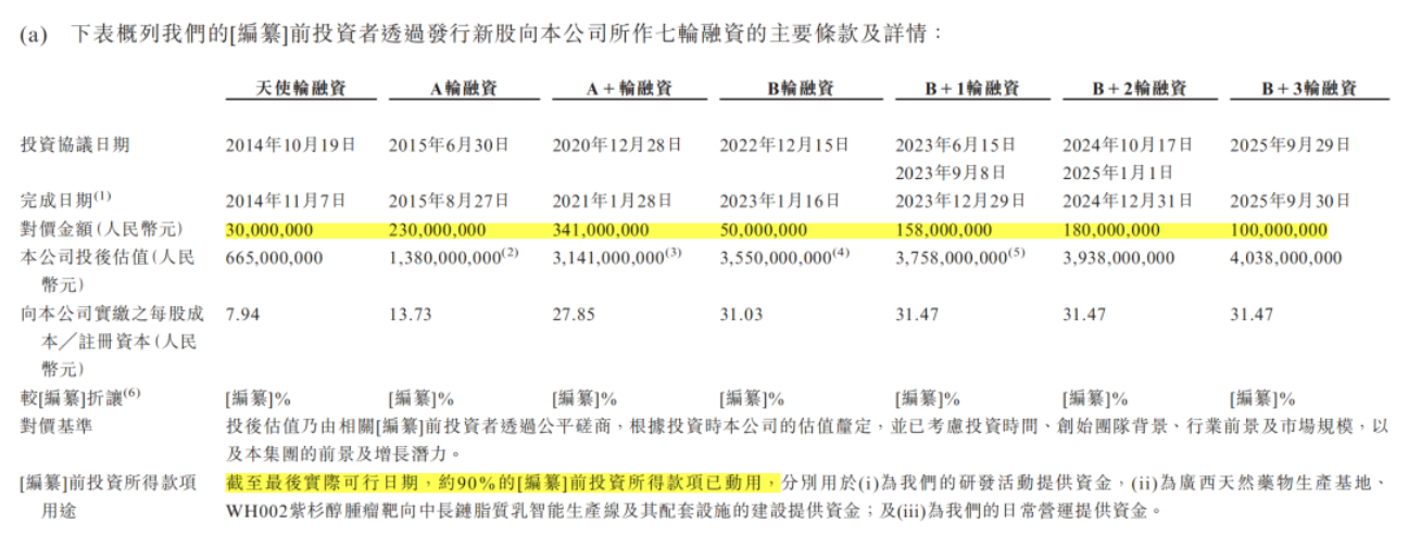 创新药物研发烧钱,成立以来,五和博澳已完成七轮融资,引入北京医药基金、朗盛集团、上海天自、同创伟业资产、北极光投资者、工融顺禧、清科产业投资等投资者本,合计融资10.89亿元,2025年9月B+3轮融资投后估值40.38亿元。