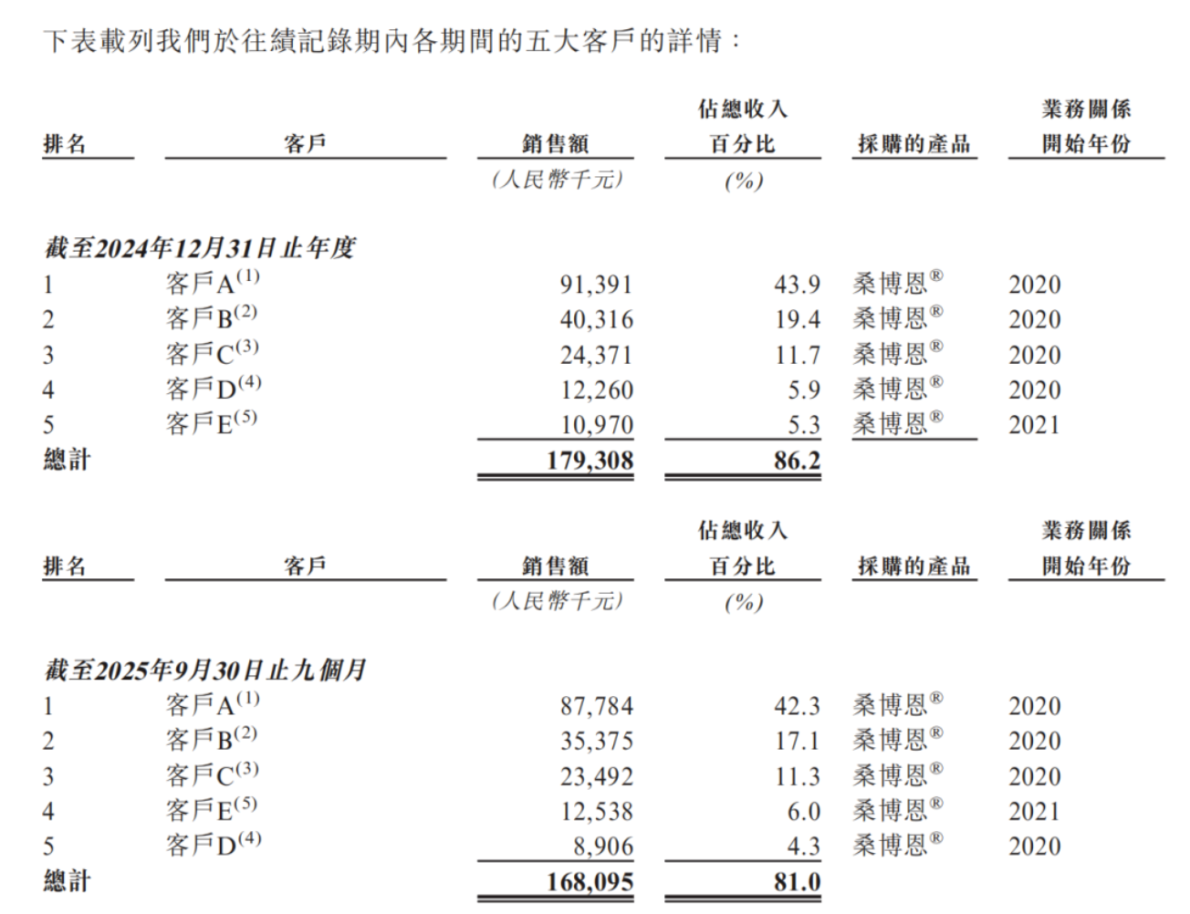 产品结构高度集中,五和博澳客户集中度同样处于高位。期内,其收入中来自前五大客户收入占比分别为86.2%、81.0%,前五大客户均为国内客户;2025年1-9月,来自前三大客户收入占比达70.7%,其中第一大客户贡献42.3%收入。