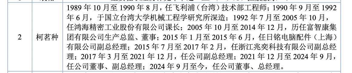 柯茗种,男,1963年12月出生,硕士研究生学历,1989年10月至1990年8月,任飞利浦(台湾)技术部工程师;1990年9月至1992年6月,于国立台湾大学机械工程学研究所深造;1992年7月至2005年10月,任鸿海精密工业股份有限公司课长;2005年10月至2014年12月,历任富智康集团有限公司生产总监、董事;2015年1月至2015年6月,任日铭电脑配件(上海)有限公司副总经理;2015年7月至2017年2月,任浙江兆奕科技有限公司副总经理;2017年3月至2021年12月,任公司副总经理;2021年12月至2024年9月,任公司董事、副总经理;2024年9月至今,任公司董事、总经理。
