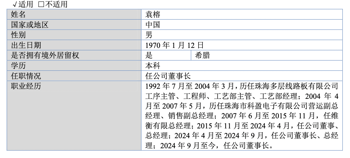 资料显示,袁榕,男,1970年1月12日出生,本科学历,1992年7月至2004年3月,历任珠海多层线路板有限公司工序主管、工程师、工艺部主管、工艺部经理;2004年4月至2007年5月,历任珠海市科盈电子有限公司营运副总经理、销售副总经理;2007年6月至2015年11月,任维衡有限总经理;2015年11月至2024年4月,任公司董事、总经理;2024年4月至2024年9月,任公司董事长、总经理;2024年9月至今,任公司董事长。