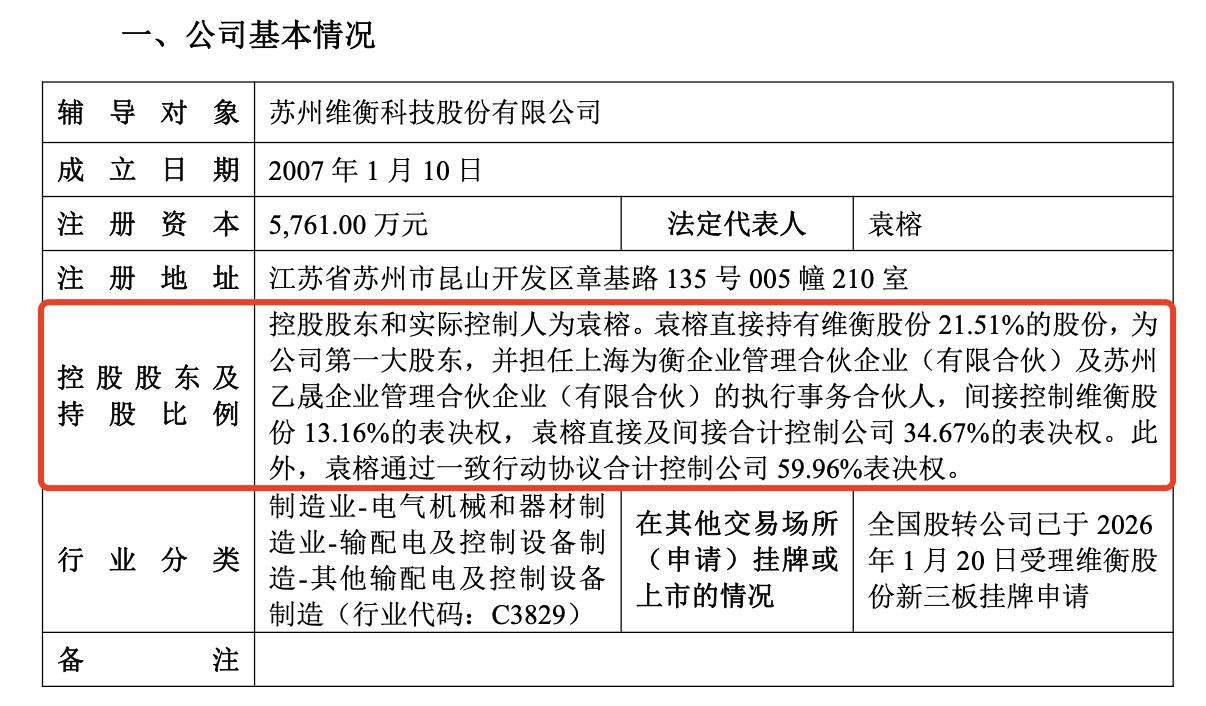 IPO前,公司的控股股东和实际控制人为袁榕。袁榕直接持有维衡股份21.51%的股份,为公司第一大股东,并担任上海为衡企业管理合伙企业(有限合伙)及苏州乙晟企业管理合伙企业(有限合伙)的执行事务合伙人,间接控制维衡股份13.16%的表决权,袁榕直接及间接合计控制公司34.67%的表决权。此外,袁榕通过一致行动协议合计控制公司59.96%表决权。