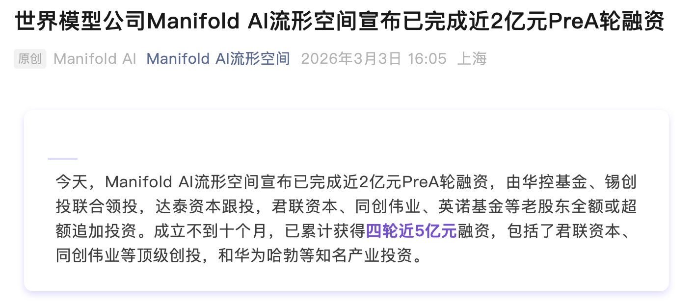 瑞财经 吴文婷 3月3日,世界模型公司Manifold AI流形空间宣布已完成近2亿元PreA轮融资,由华控基金、锡创投联合领投,达泰资本跟投,君联资本、同创伟业、英诺基金等老股东全额或超额追加投资。