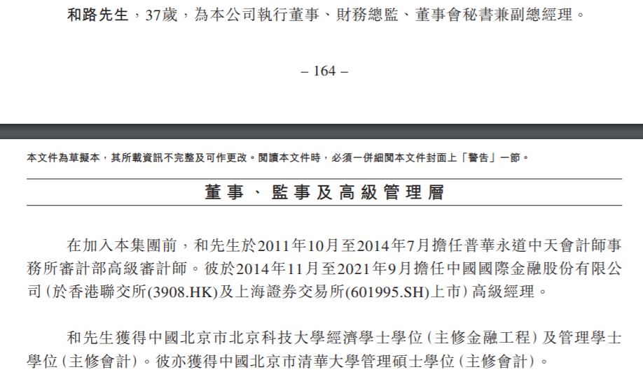 在加入集团前,和路于2011年10月至2014年7月担任普华永道中天会计师事务所审计部高级审计师;于2014年11月至2021年9月担任中国国际金融股份有限公司高级经理。