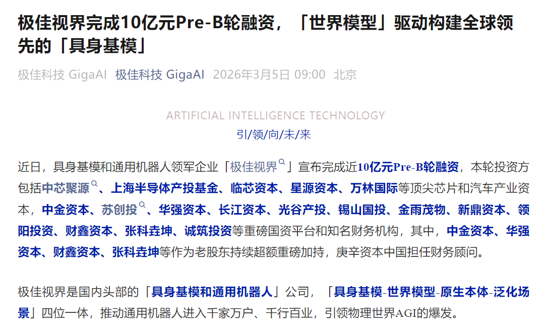 瑞财经 王敏 3月5日,据极佳科技官微消息,具身基模和通用机器人领军企业北京极佳视界科技有限公司(以下简称“极佳视界”)宣布完成近10亿元Pre-B轮融资。