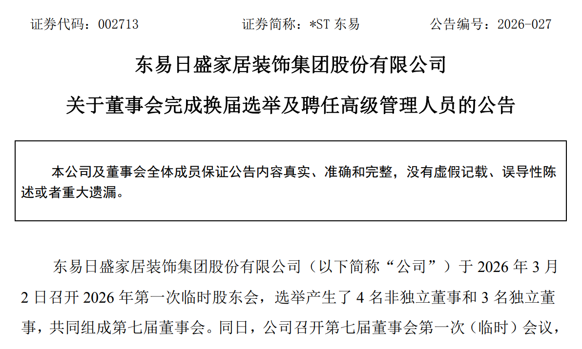 3月3日,*ST东易(002713.SZ)发布公告称,已完成董事会及高级管理人员换届工作。东易日盛第七届董事会由7名董事组成,其中包括4名非独立董事和3名独立董事。