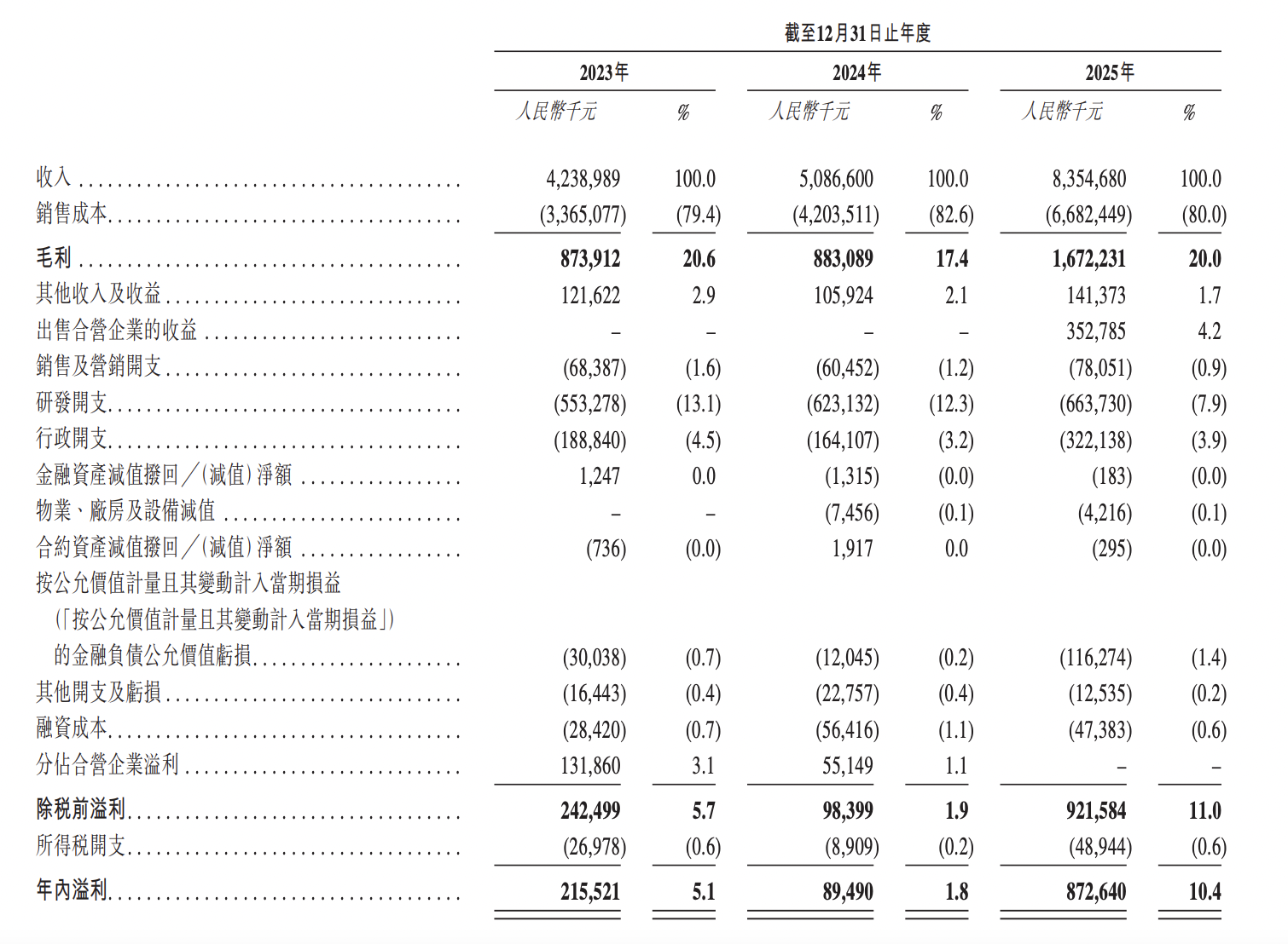 2023年、2024年及2025年,纳真科技收入分别为42.39亿元、50.87亿元、83.55亿元,年内溢利分别为2.16亿元、8949万元、8.73亿元,毛利率分别为20.6%、17.4%、20%。其中,公司2025年收入同比增长64.25%,年内溢利同比增长875.13%。