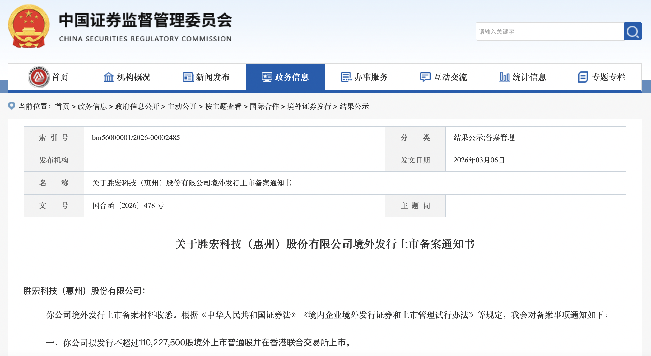 瑞财经 吴文婷 3月6日,胜宏科技(惠州)股份有限公司(以下简称“胜宏科技”)IPO获中国证监会备案,公司拟发行不超过110,227,500股境外上市普通股并在香港联合交易所上市。