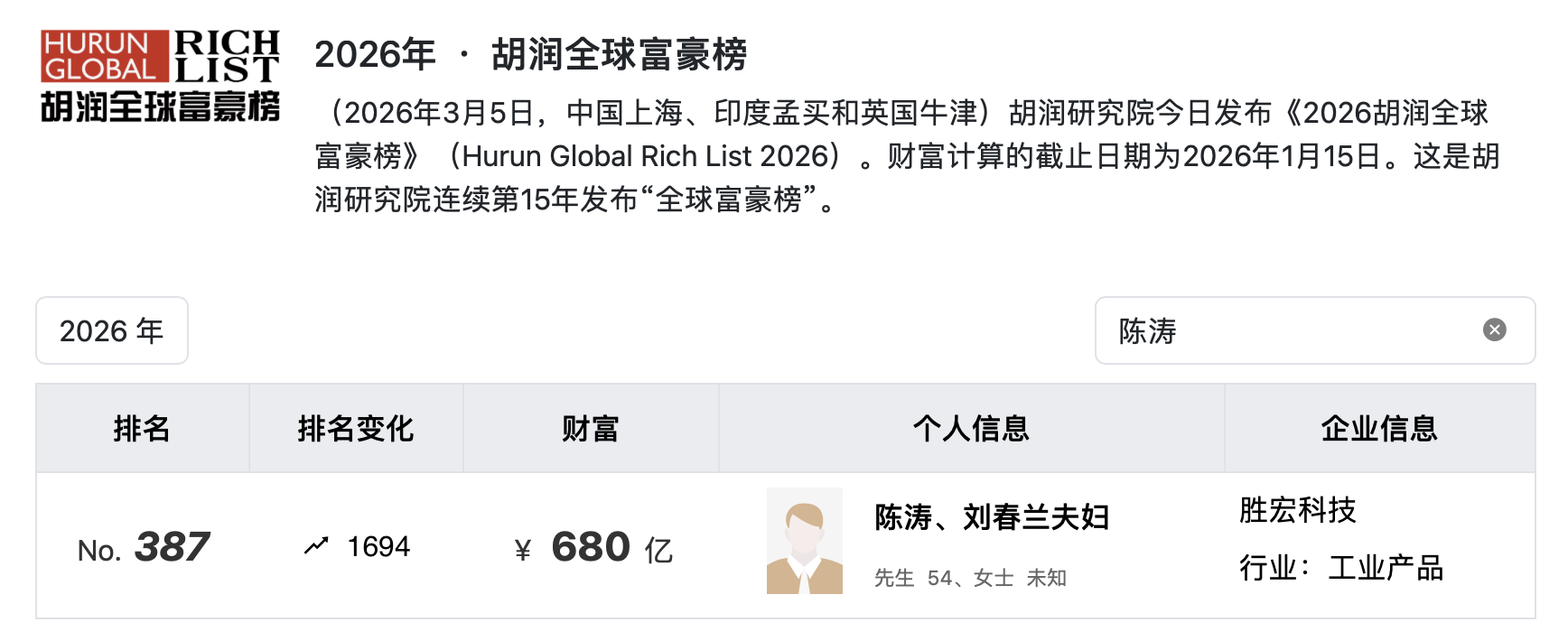 据《2026年胡润全球富豪榜》,陈涛、刘春兰夫妇的财富达680亿,排在第387位。