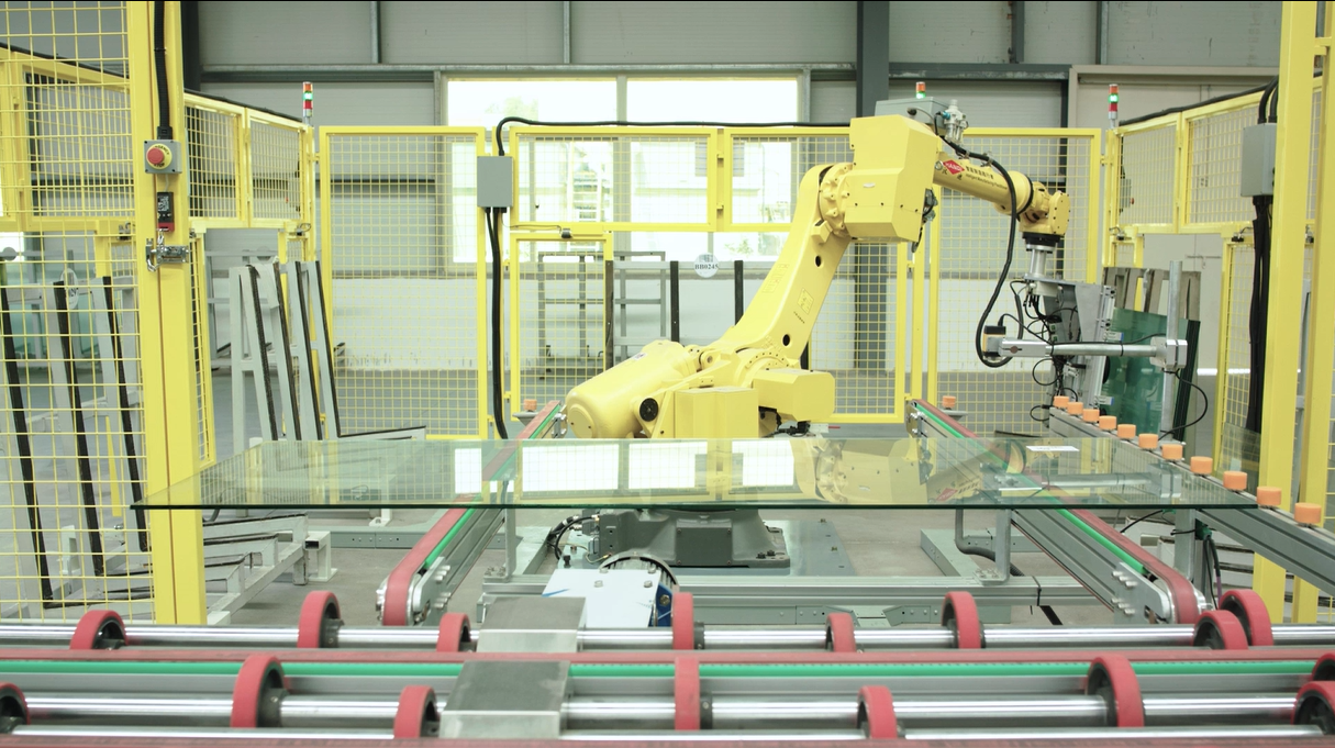 位于福建南安的九牧淋浴房智能工厂,全自动的切割、磨边、钻孔、钢化一体化深加工生产流水线,保障定制产品的品质与交付效率。