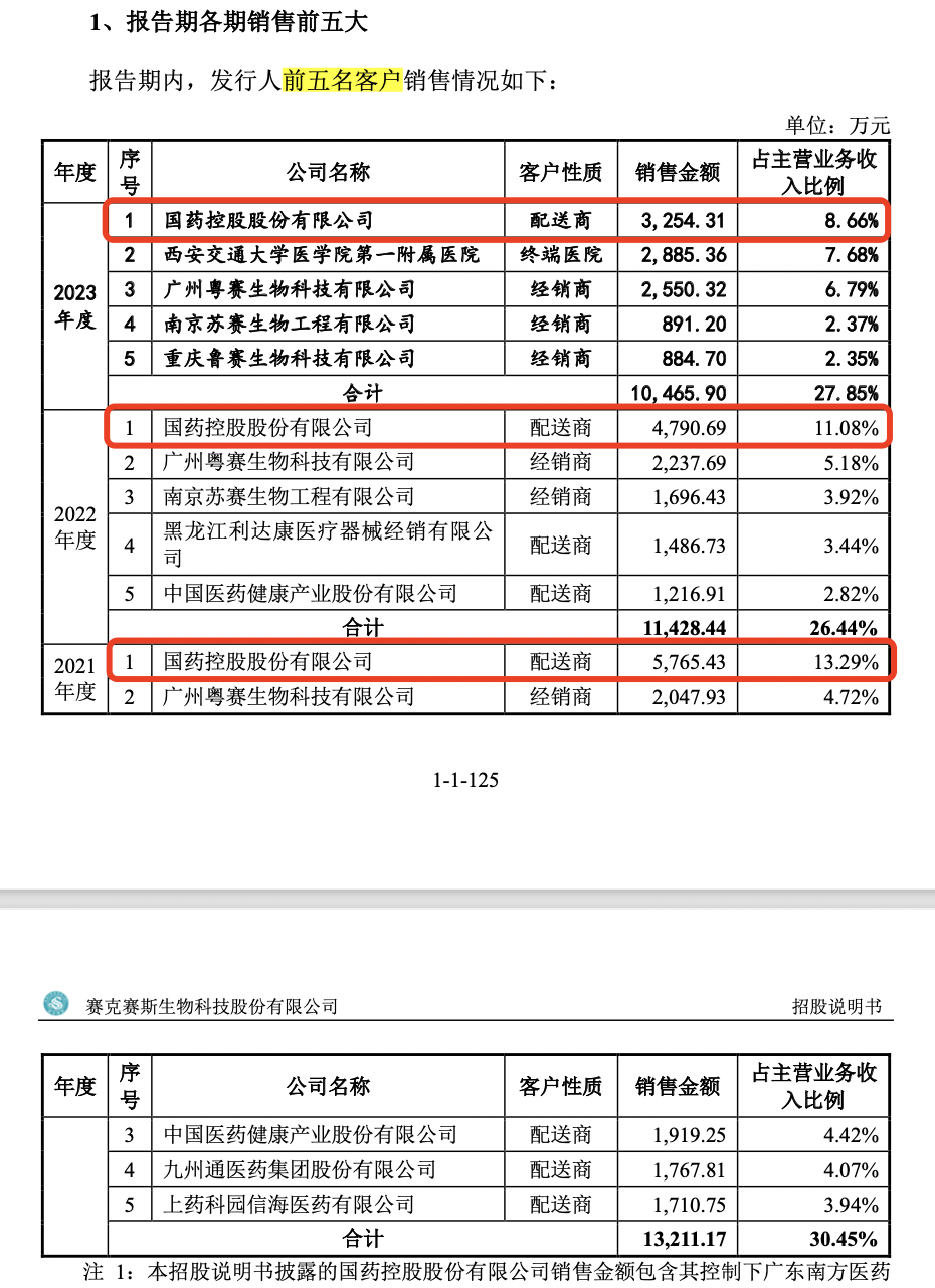 据招股书,2021年-2023年,国药控股股份有限公司均为公司第一大客户,销售金额占比分别为13.29%、11.08%、8.66%。