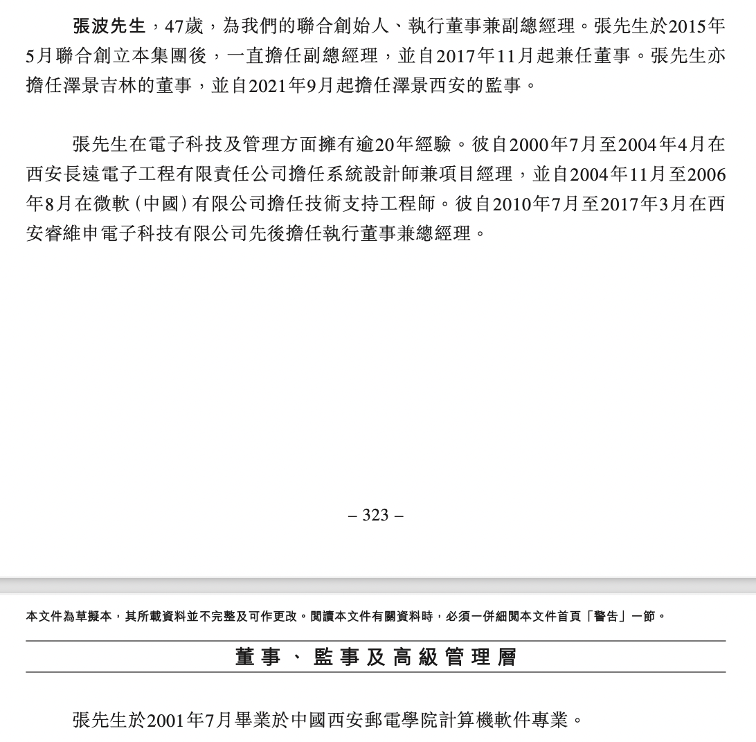 张波,47岁,为公司的联合创始人、执行董事兼副总经理。张波于2015年5月联合创立集团后,一直担任副总经理,并自2017年11月起兼任董事。张波亦担任泽景吉林的董事,并自2021年9月起担任泽景西安的监事。