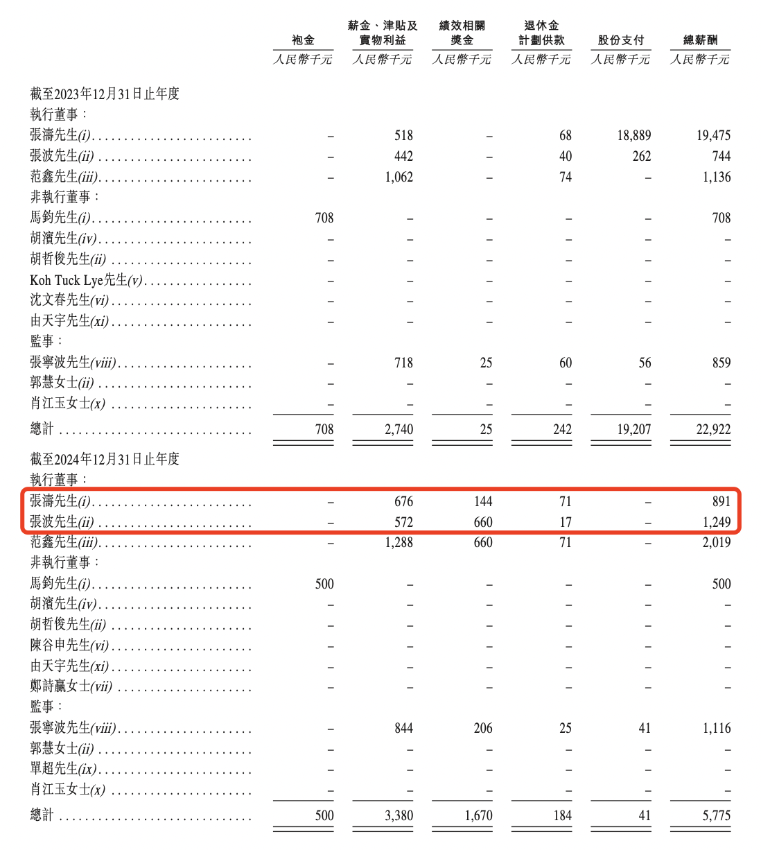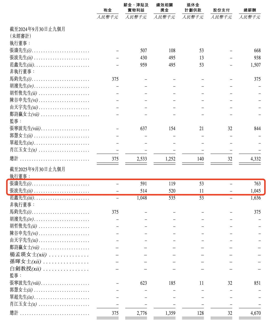 2025年前三季度,张涛的薪酬总额约76.3万元,当中包含薪金、津贴及实物利益约59.1万元;张波的薪酬总额约104.5万元,当中包含薪金、津贴及实物利益约51.4万元。