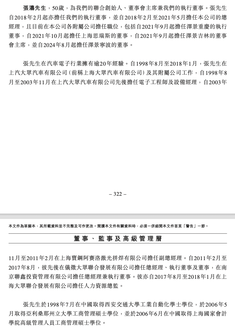 资料显示,张涛,50岁,为公司的联合创始人、董事会主席兼执行董事。张涛自2018年2月起亦担任公司的执行董事,并自2018年2月至2021年5月担任公司的总经理,且目前在公司各附属公司担任职位,包括自2021年9月起担任泽景重庆的执行董事,自2021年10月起担任上海思瑞斯的董事,自2021年9月起担任泽景吉林的董事会主席,并自2024年8月起担任泽景宁波的董事。