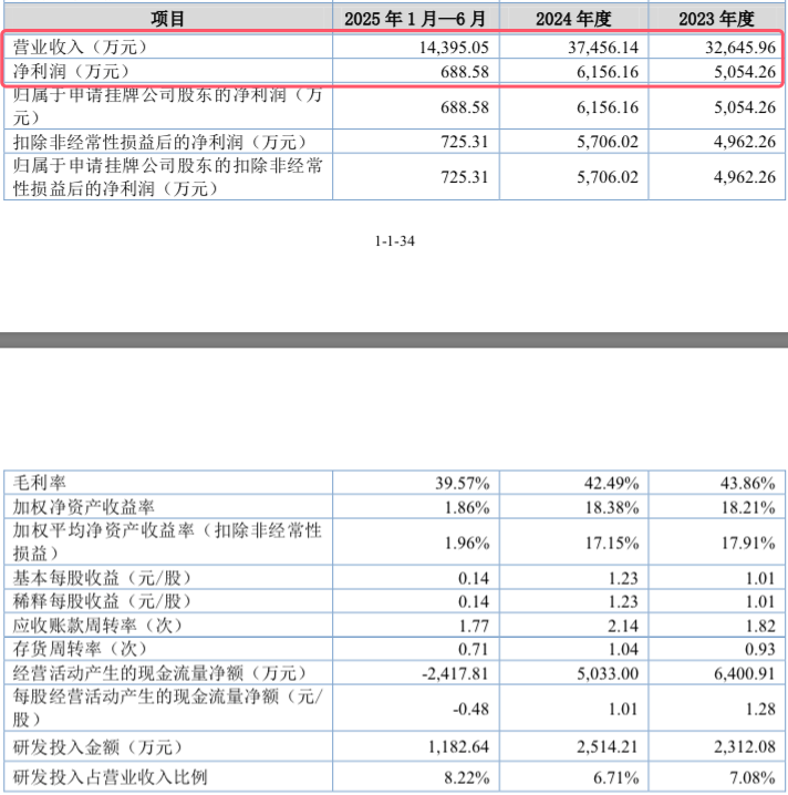 业绩方面,2023年至2024年以及2025上半年,公司营业收入分别为 3.26亿元、3.75亿元和1.44亿元,扣除非经常性损益后归属于公司股东的净利润分别为4962.26万元、5706.02万元和725.31万元,综合毛利率分别为43.86%、42.49%及39.57%。