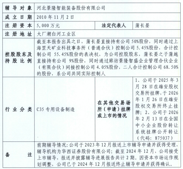 据瑞财社查阅,景隆智装曾于2023年由华西证券进行IPO辅导,2024年12月终止辅导。2026年2月,景隆智装在新三板挂牌。